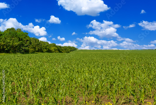 Spring landscape with green field .