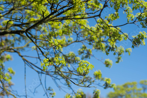 spring maple tree branches against blue sky