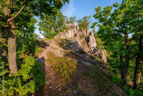 Spring mountain green forest illuminated by the sun. Green forest scenery with rocks. Mountain spring hiking, lush green landscape. Hiking theme outdoor