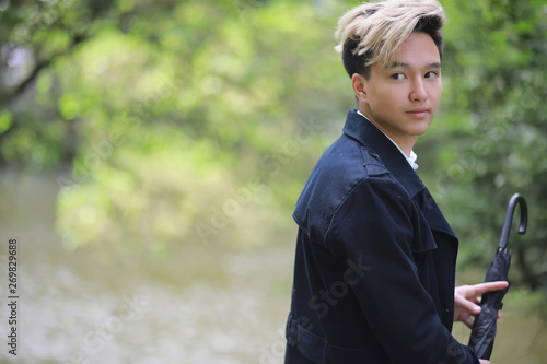 Spring rainy weather and a young man with an umbrella