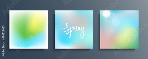 Spring season blurred backgrounds set with bright sun and hand lettering for your seasonal graphic design. Springtime collection. Vector illustration.