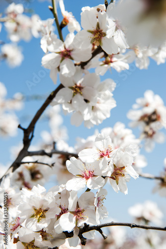 Spring trees with blossom flowers. Beautiful background. Blooming tree at sunny spring day. Spring flowers. Abstract blurred background. Springtime