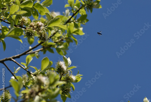 spring willow twigs with spiky inflorescences and a black insect