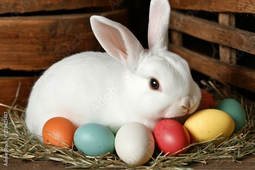 Springtime delight with an Easter bunny and eggs on a verdant grass field