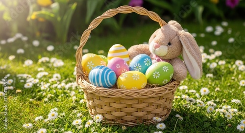 Springtime Easter celebration with decorated eggs and bunny in a basket