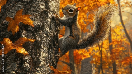 Squirrel Climbing a Tree in Autumn Forest