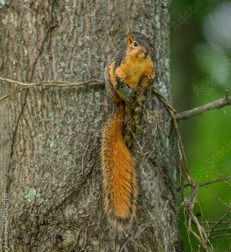 Squirrel on a Tree Branch with Green Background