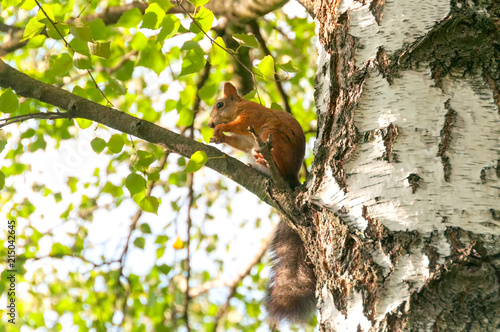 Squirrel sits on birch tree in profile. Moscow, Russia.