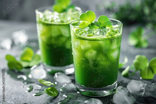 St. Patricks Green lemonade glass on grey surface with ice cubes