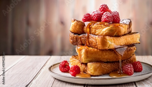 Stack Of French Toast Topped With Raspberries And Syrup Celebrating International French Toast Day