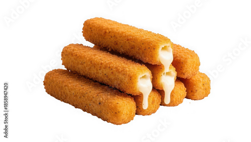 Stack of golden fried mozzarella sticks with oozing cheese, isolated on transparent background