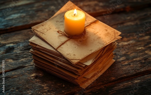 Stacked old letters with candlelight on rustic wood. Possible use Stock photo for historical themes, vintage aesthetics, or letter writing