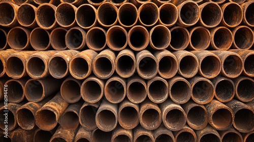 Stacked rusted metal pipes creating a symmetrical industrial pattern