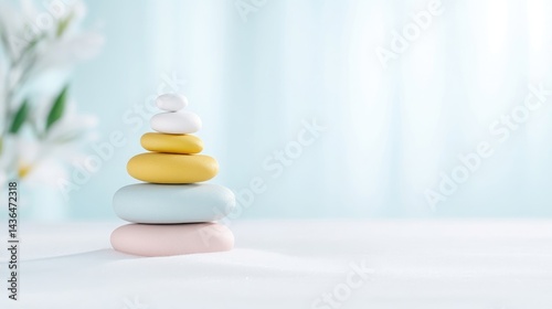 Stacked Stones Flower Arrangement Soft Pastel Style High-Resolution Soft Lighting Center Vertical Shot Smooth Textures Balanced Zen Concept Blurred Background Soft Blue Hues Wellness Website Design