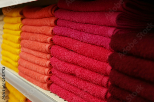 Stacks of colourful towels on store shelf, closeup