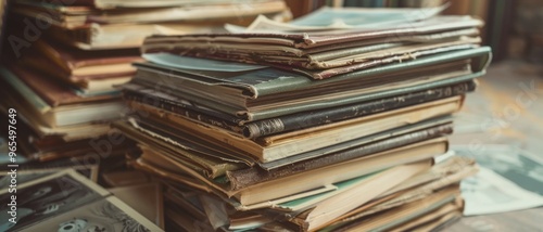 Stacks of old books and photographs, evoking nostalgia and timeless memories.