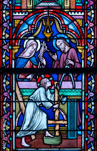 Stained glass (19th century) of Holy family: Jesus infant, Virgin Mary and St Joseph in the workshop of Joseph the carpenter.