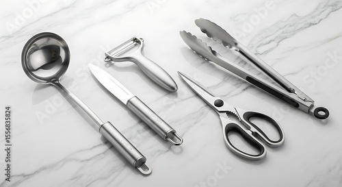 Stainless steel kitchen utensils including a ladle, peeler, knife, scissors, and tongs arranged on a marble surface.