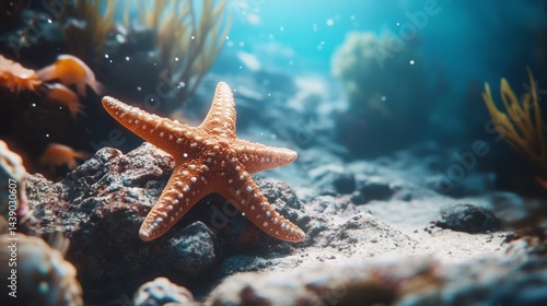 Starfish resting on a rocky sea floor in a vibrant underwater landscape during midday