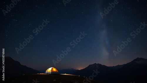 Starry mountain landscape at night with an illuminated tent under the milky way, serene and vast.