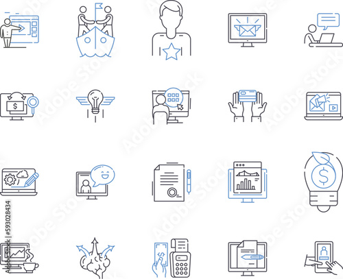 Start up management outline icons collection. Entrepreneurship, Incubation, Venture, Capital, Investment, Growth, Expansion vector and illustration concept set. Planning, Strategy, Innovation linear