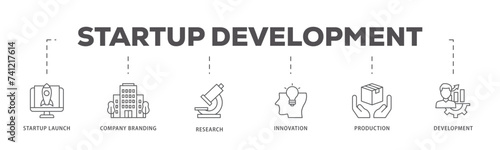 Startup development icons process flow web banner illustration of development, production, innovation, research, company branding, startup launch icon live stroke and easy to edit