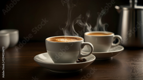 Steam Rising Aromatic Coffee Latte Cups Dark Wood Setting