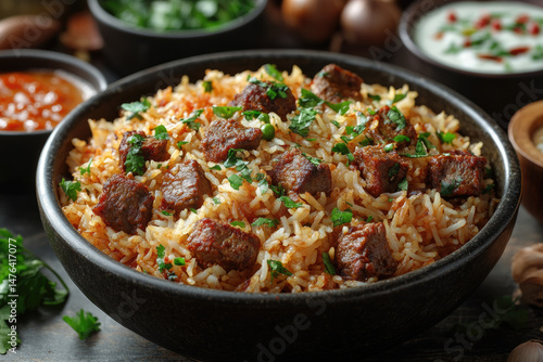 Steaming Biryani Surrounded by Authentic Indian Side Dishes and Raita