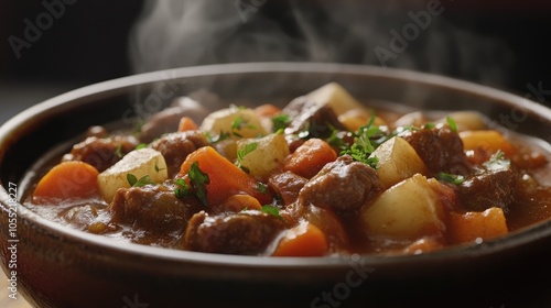 Steaming Bowl of Beef Stew with Carrots and Potatoes
