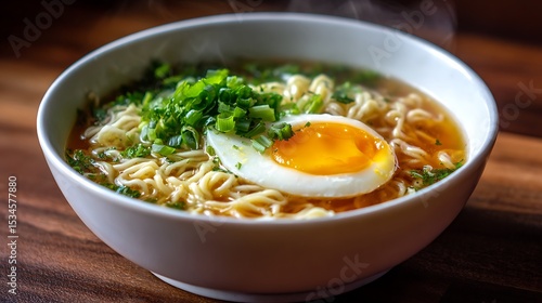 Steaming Bowl of Ramen with Soft-Boiled Egg and Fresh Herbs