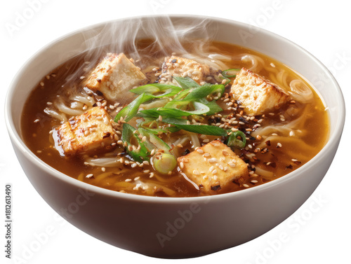 Steaming bowl of savory miso soup with tofu and sesame seeds, a comforting and delicious meal.