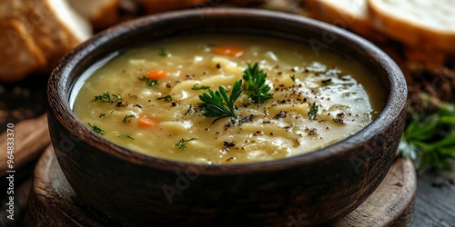 Steaming Chicken Broth with Fresh Parsley on Rustic Table