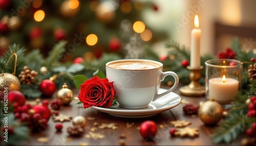 Steaming cup of coffee is surrounded by festive decorations, red rose on the saucer adds festive touch Cozy scene with soft candlelight for cafes, event planners and seasonal decorators
