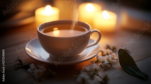 Steaming Cup of Sage Tea with Floral Aroma and Soft Candlelight Glow