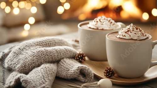 Steaming hot chocolate on a wooden table near a fireplace, family gathered, warm holiday lighting, cozy close-up