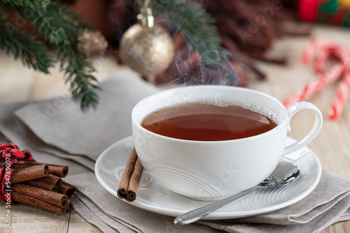 Steaming hot cup of tea with Christmas decorations