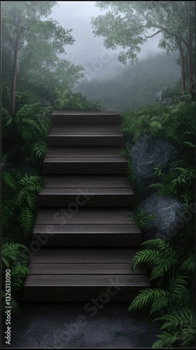 Steps lead through lush greenery towards a misty forest at dawn, inviting exploration and wonder in a tranquil natural setting