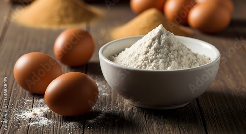 Still life of a bowl of flour with eggs and spices on a rustic wooden table with warm tones and a shallow depth of field.