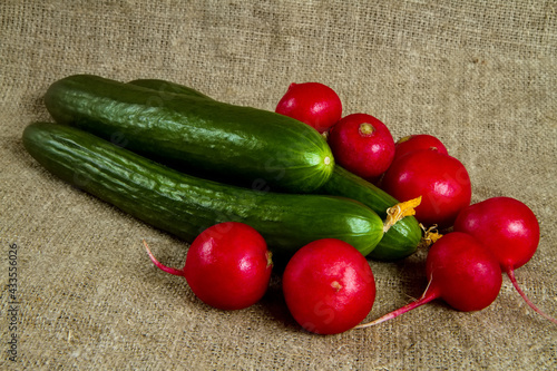 Still life of radishes and cucumbers on the background of burlap. Fresh spring vegetables.
