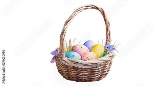Still life watercolor painting of an Easter basket with colorful eggs.