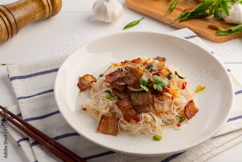 Stir Fried Rice Vermicelli with Bacon chilli and Holy Basil Seasoning in white plate.