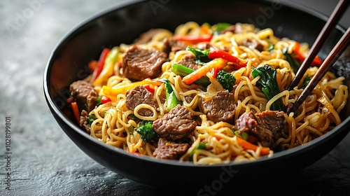 Stir fry noodles with vegetables and beef in black bowl Slate background Top view : Generative AI