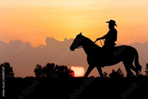Stock Photo: silhouette of Cowboy sitting on his horse at sunset background