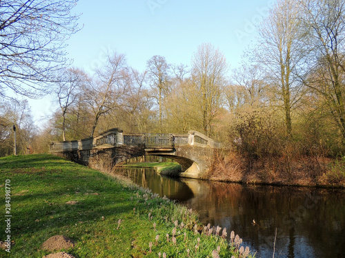 Stone bridge over canal in park. Spring