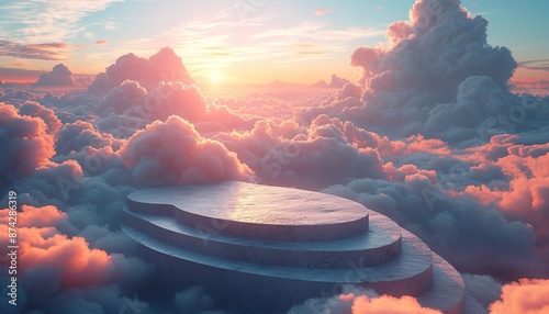Stone round podium on the background of water with the setting sun, ocean with splashes of waves and water