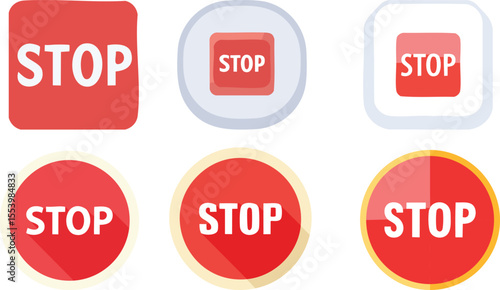 STOP Icons in a Two-by-Three Grid Layout Featuring Square and Circular Designs in Bold Red, White, and Yellow Tones