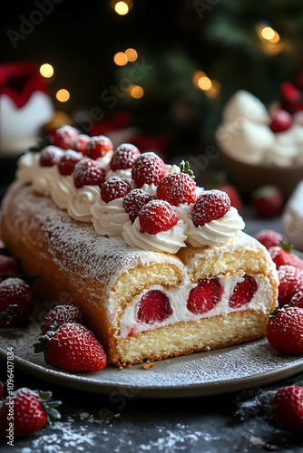 Strawberry cream roulade on a cake plate, fresh strawberries and whipped cream around, cheerful christmas kitchen vibe