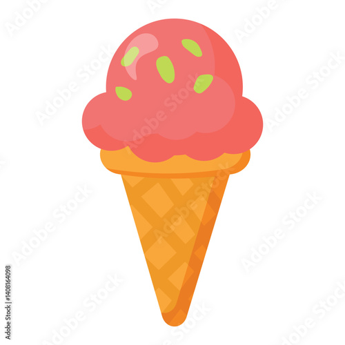 Strawberry ice cream in a waffle cone with green sprinkles, ideal for dessert menus, summer designs, kids’ projects, and food-themed decorations
