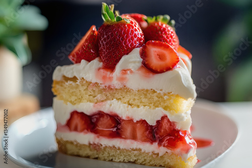 Strawberry shortcake slice with whipped cream and fresh fruit