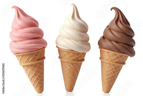 Strawberry, vanilla and chocolate soft ice creams or frozen custard in cone isolated on white background. 3d rendering.